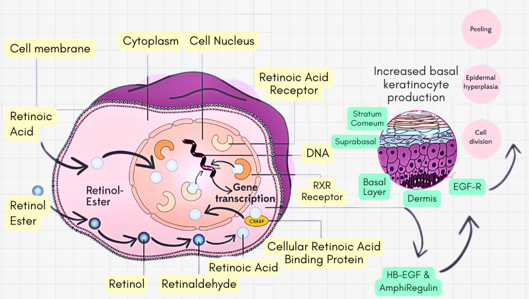 Retinoids work by binding to retinoic acid receptors (RARs) in skin cells, influencing how they grow, function, and regenerate. Their effects are seen on multiple layers of the skin: