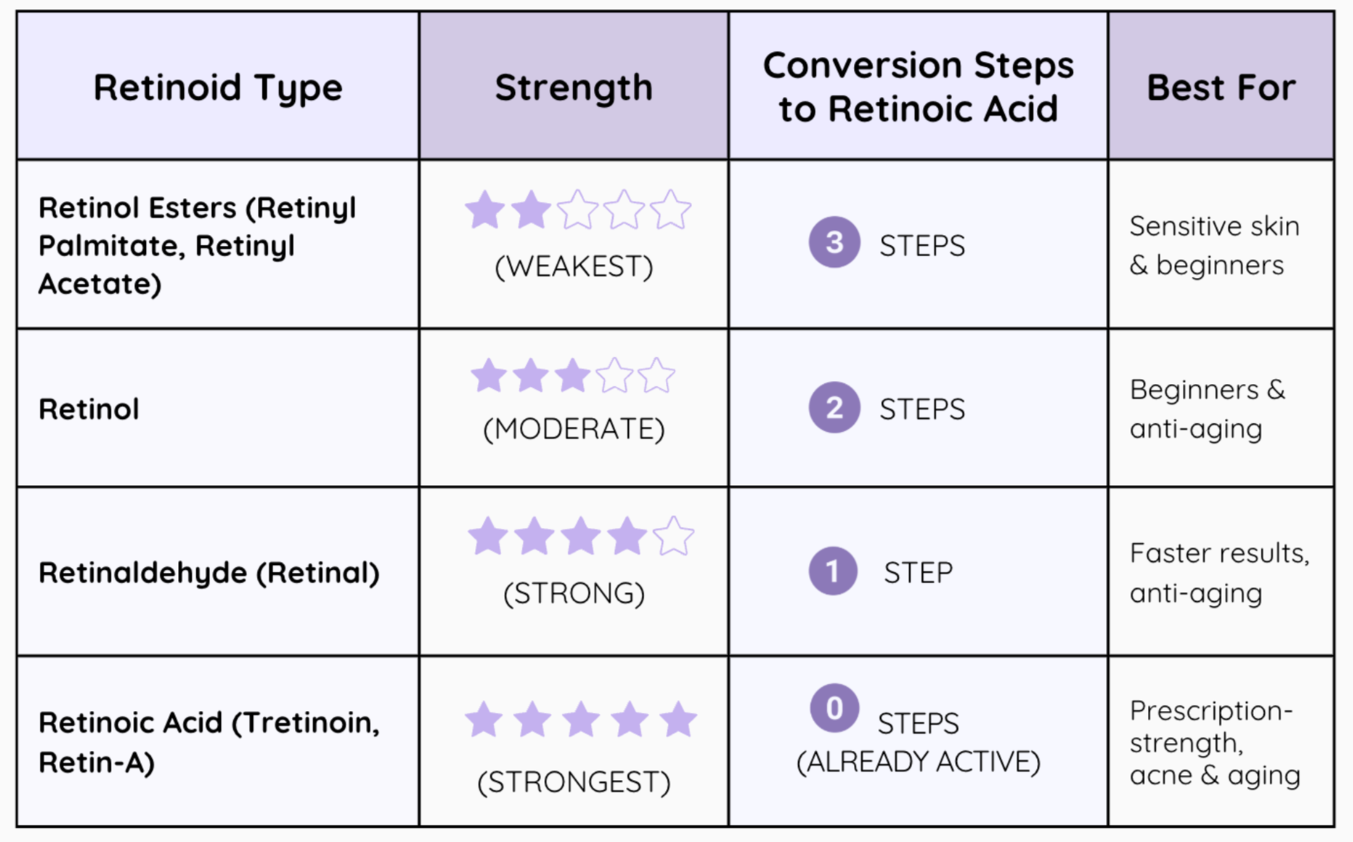 Retinoids must convert into Retinoic acid, the active form that affects the skin. The fewer the conversion steps, the more potent and fast-acting the retinoid is.