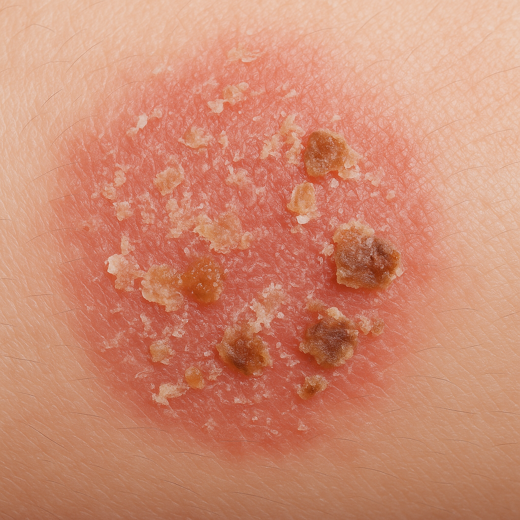 - Sprucken, blödande eller vätskande hud, vilket kan indikera infektion